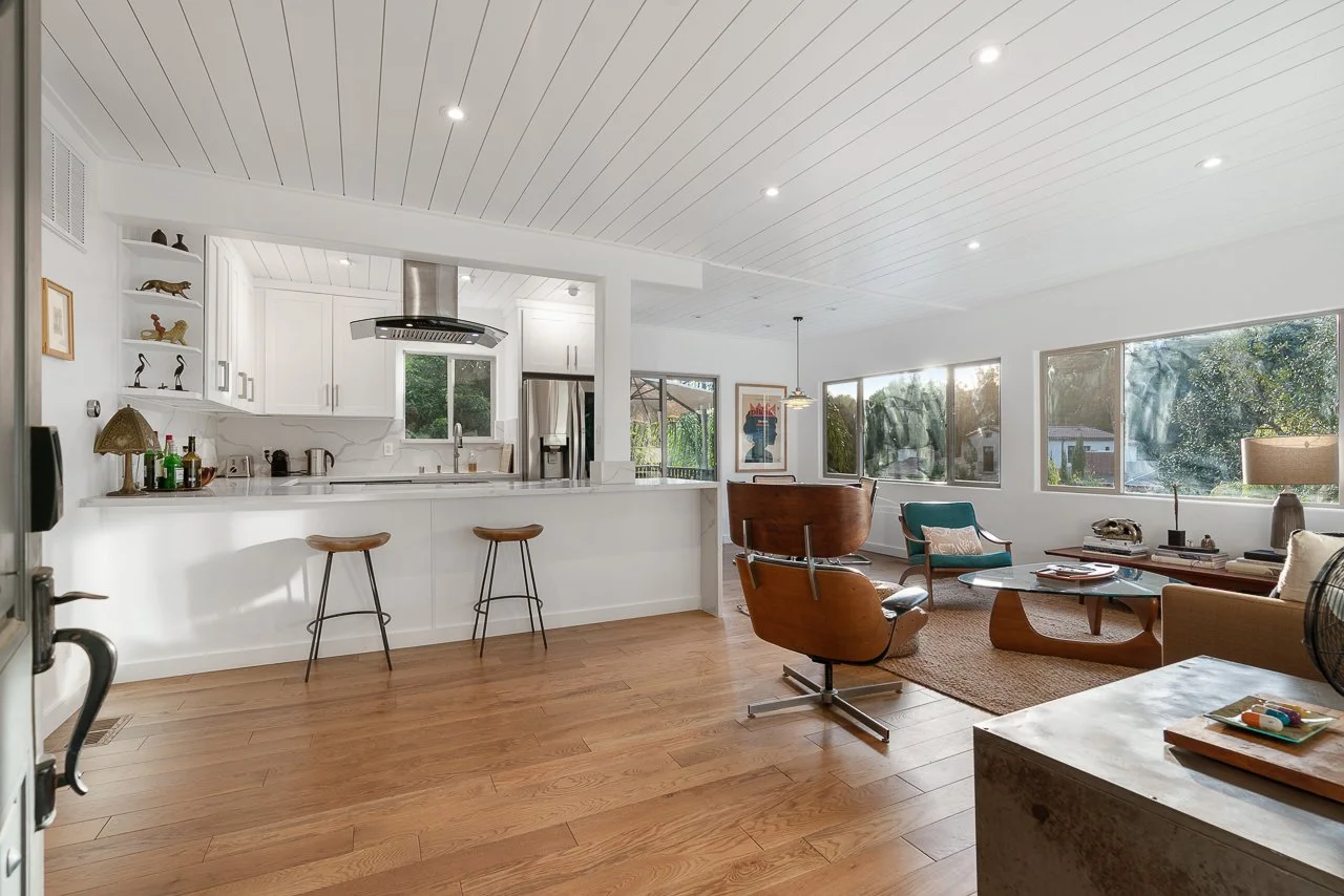 At the top of coveted Beachwood Canyon. The view of the Hollywood sign is unparalleled as the home is situated right under the famous landmark, which is visible from a charming gazebo and sitting area in the garden. The home is elevated from the street, making the views even more incredible and very private, as most windows look out onto the terraced garden surrounding the house. There is a covered dining deck off of the kitchen with a table and seating, making al fresco dining a dream. The trailhead and hike to the Hollywood sign in Griffith Park are about two blocks away. The house is beautifully and tastefully furnished in a midcentury modern style. The entire house was recently renovated, so all cabinets, bathrooms, paint, and some appliances are brand new. The second bedroom is set up as a wonderful office, but offers a convertible sofa bed, should you require a 2nd sleeping quarter. Washer and Dryer are inside the house. Below is an attached garage with electronic opener. The terraced garden is planted with a wide variety of plants and trees, and has full automatic landscape lighting. Gardener included. Apartment comes completely furnished with mid-century-style designer furnishings.