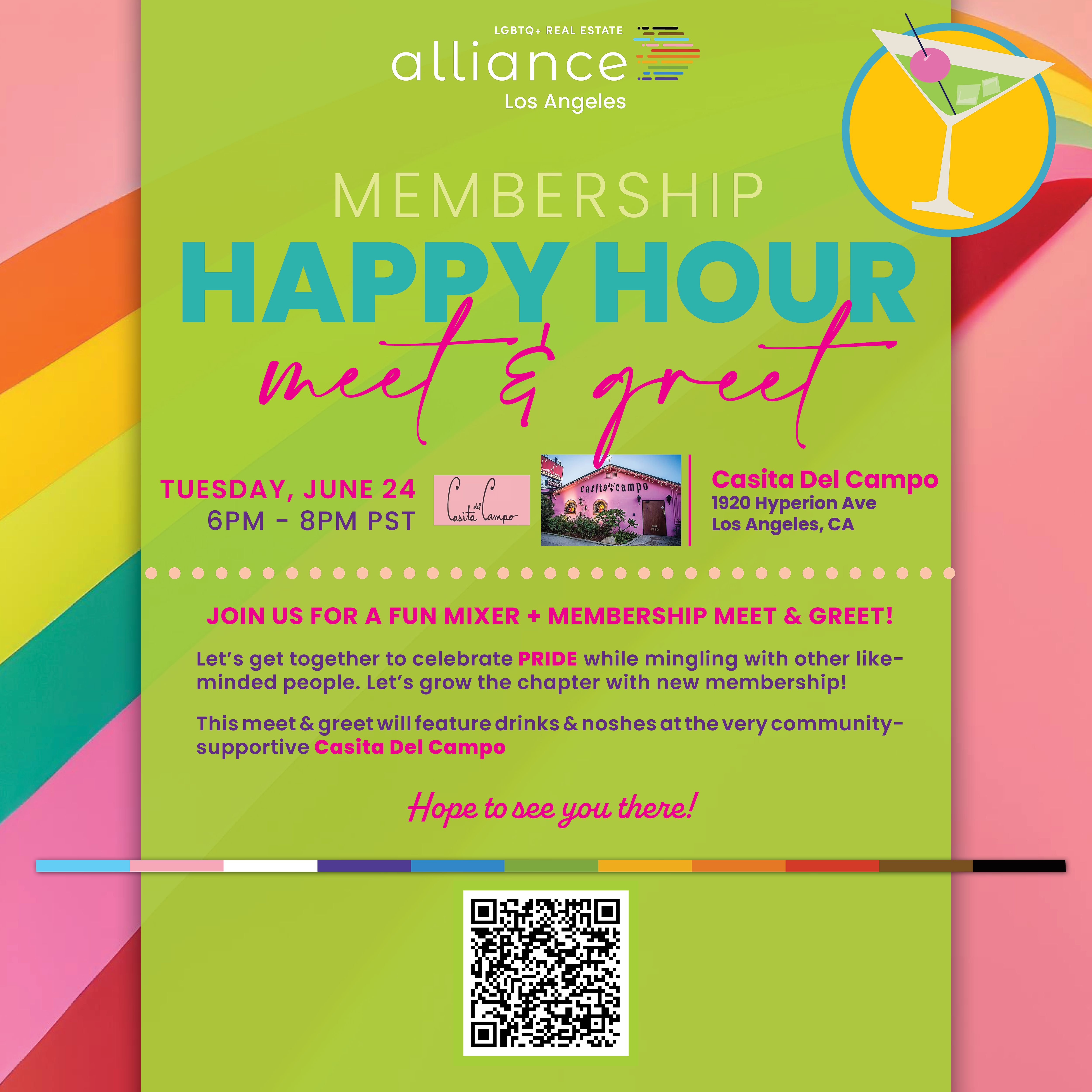 | I couldn't be more thrilled and honored to become a board member of the LGBTQ+ Real Estate Alliance. I look forward to contributing to meaningful progress and providing support where it’s most needed. We are hosting a Meet & Greet and Membership Happy Hour on Tuesday, June 24th from 6 to 8 pm at Casita Del Campo. Please come and get to know more about the Alliance and meet new people in this beautiful community 💛 |